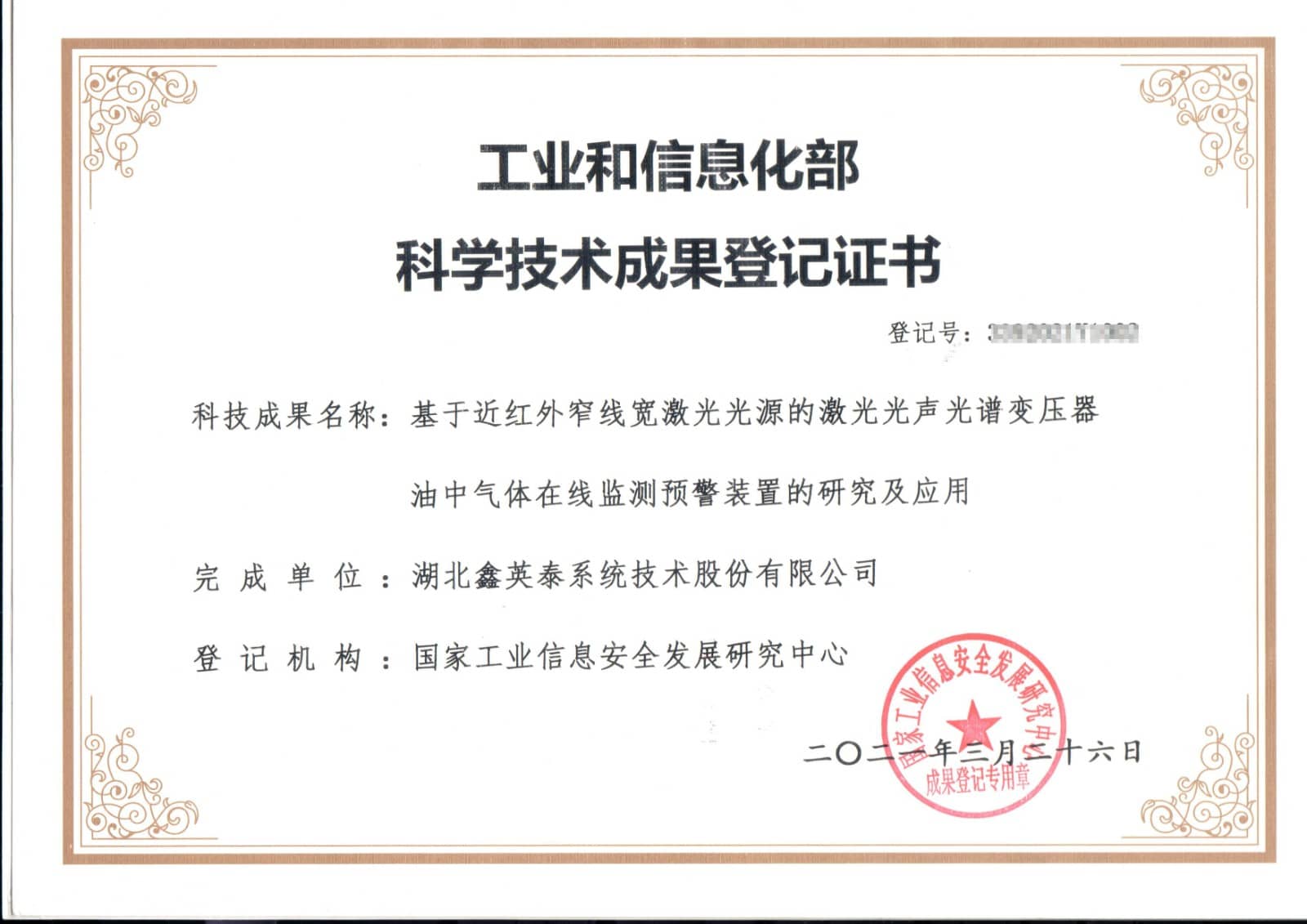 近日,湖北9728太阳集团系统技术股份有限公司的“基于近红外窄线宽激光光源的激光光声光谱变压器油中气体在线监测预警装置的研究及应用”项目,接获中国高科技产业化研究会和国家工业信息安全发展研究中心出具的科技成果评价报告、成果认定及备案登记证书。