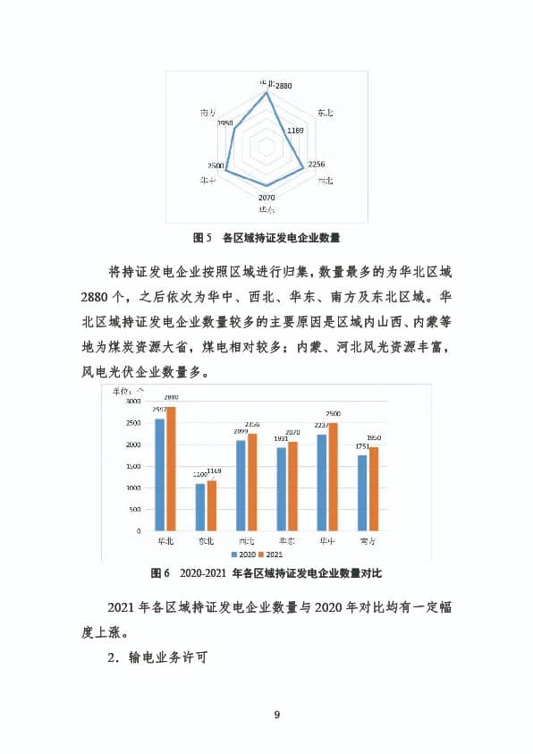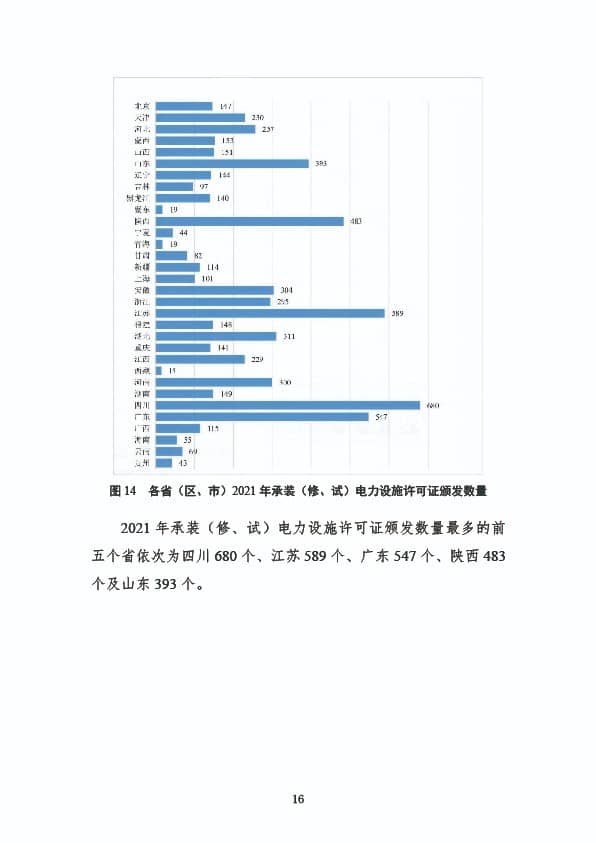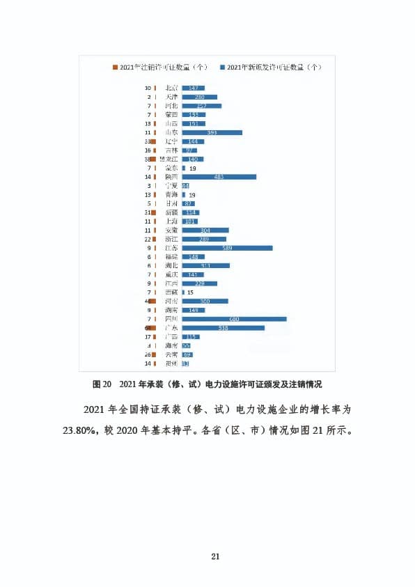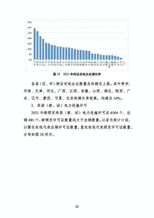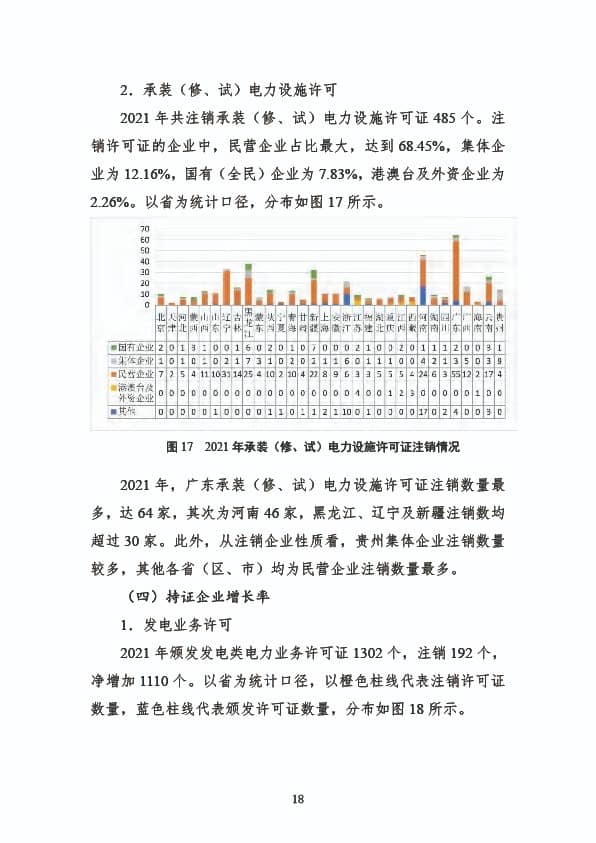 持证发电企业数量稳健增长,输电、供电企业数量保持稳定,承装(修、试)电力设施企业数量较快增长。截至 2021 年底,全国持有电力业务许可证企业共有15722 家。全国持证承装(修、试)电力设施企业共有31609家,较2020 年增加 6079 家,增长率为24%,新增持证企业中,民营企业占比达87%。