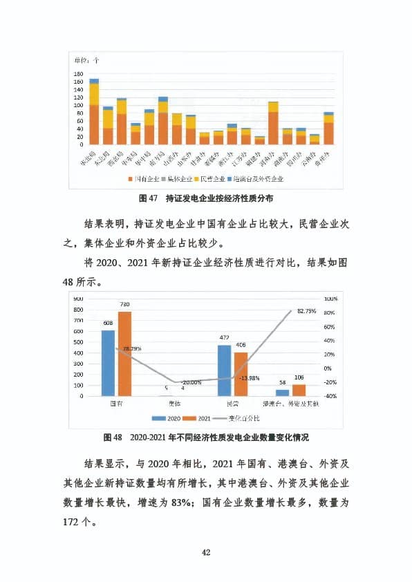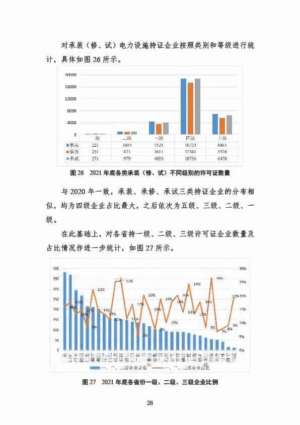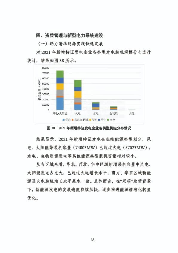 市场主体结构与规模变化各具特色,新能源成为发电装机增长的主力,承装(修、试)电力设施企业综合能力稳步提升。持证发电企业总装机容量为2067237MW。持证可再生能源企业装机占比快速提高,新增持证风电、太阳能装机容量 74803MW,已超过火电新增装机容量(57023MW),占持证企业全年新增总装机容量的近 50%,许可管理有效促进发电行业持续转型升级。从承装(修、试)电力设施企业许可等级分布看,四级企业占比最大,达60%。承装、承修、承试 3 个许可类别间的业务关联性较强,同时持有3 个类别许可的企业占比达到86%,占比进一步提高。