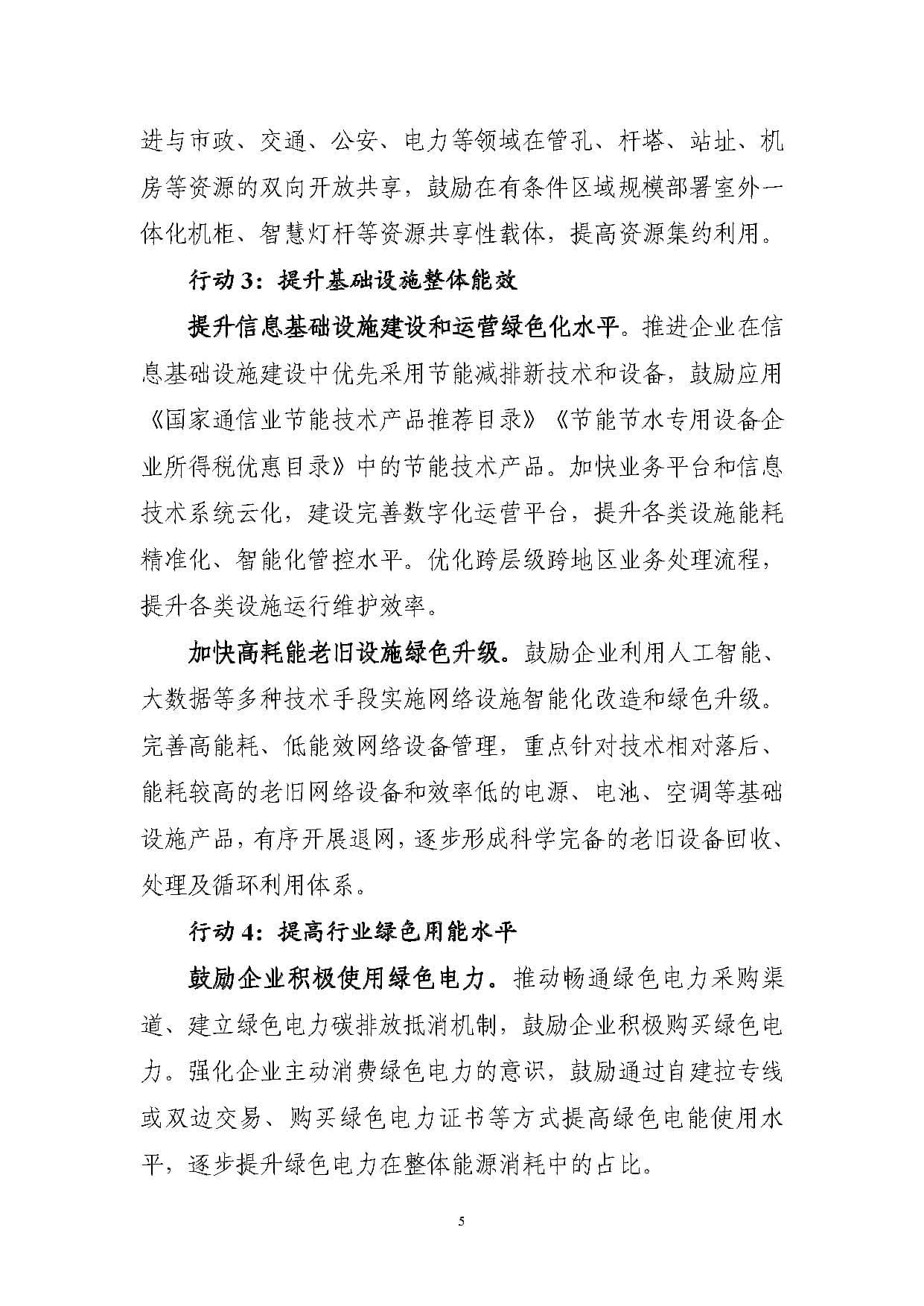 《计划》瞄准“优布局、抓重点、促协同、强赋能、统管理”五大方向确立实施路径,提出15项具体行动。15项行动提出:打造绿色低碳信息基础设施,推进网络架构优化,精简网络层级和网络设备节点数量,逐步形成以数据中心为核心的扁平化、云网融合、云边端协同的网络架构和算力设施体系;深入推进通信网络设施共建共享,持续开展5G接入网共建共享,深入推进管道、杆路、光缆、机房、室分等网络基础设施共建共享共维;加快高耗能老旧设施绿色升级,鼓励企业利用人工智能、大数据等多种技术手段实施网络设施智能化改造和绿色升级;加大绿色能源推广使用,推进新型储能技术与供配电技术的融合应用;支持智能光伏在信息通信领域示范应用;推进绿色数据中心建设,加快国家绿色数据中心建设,引导企业建设绿色集约型数据中心,加快”老旧小散”存量数据中心资源整合和节能改造;助力重点行业绿色化转型,鼓励信息通信企业积极配合电网企业推进配电网智能化升级,打造 5G 智能电网,推广5GSA切片智能分布式配电、5G基站削峰填谷供电等绿色低碳应用等。